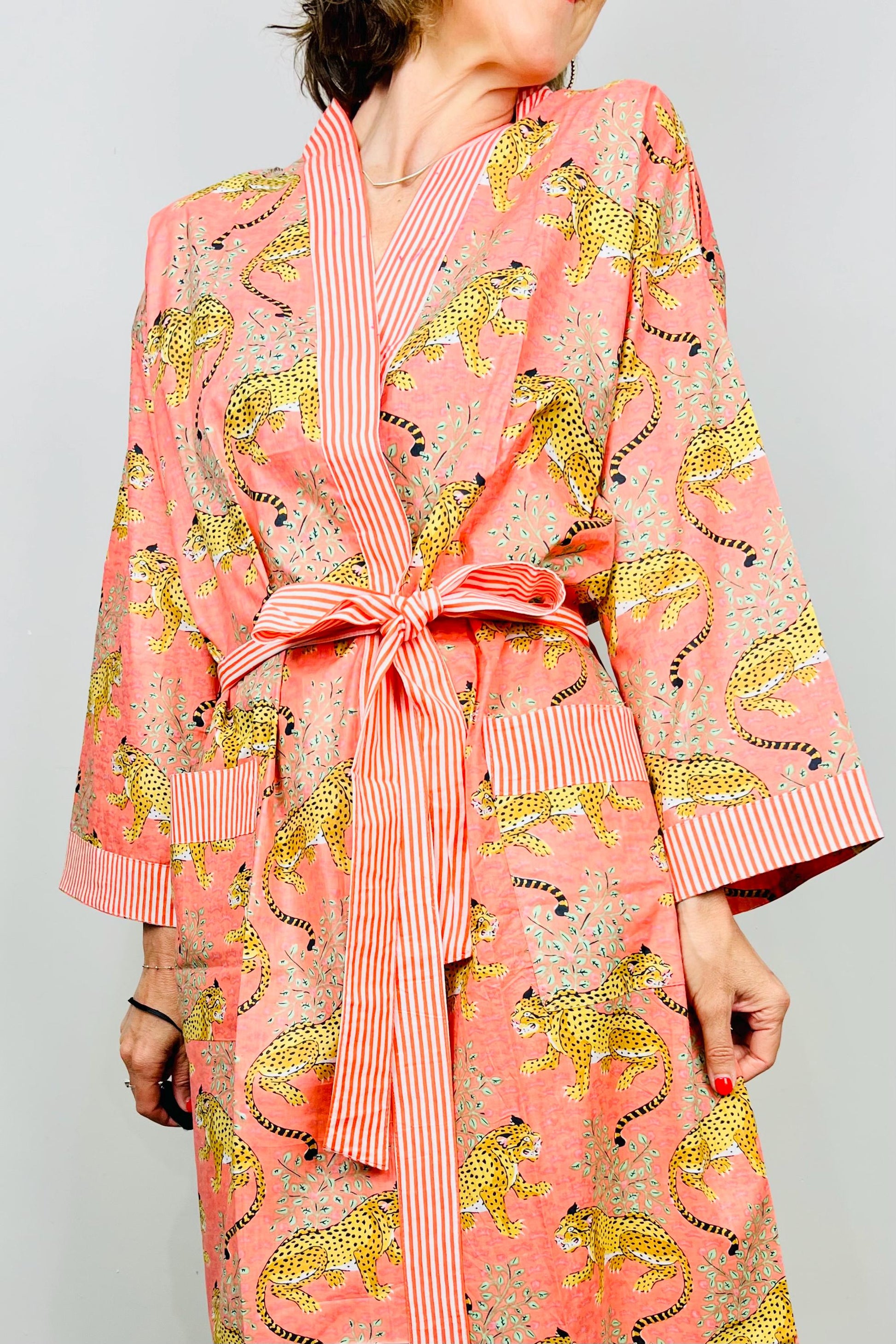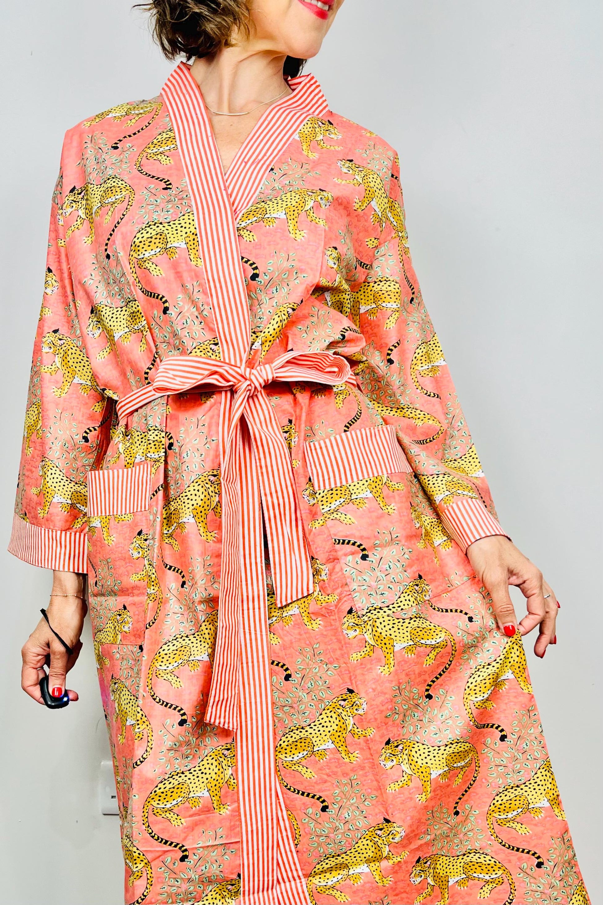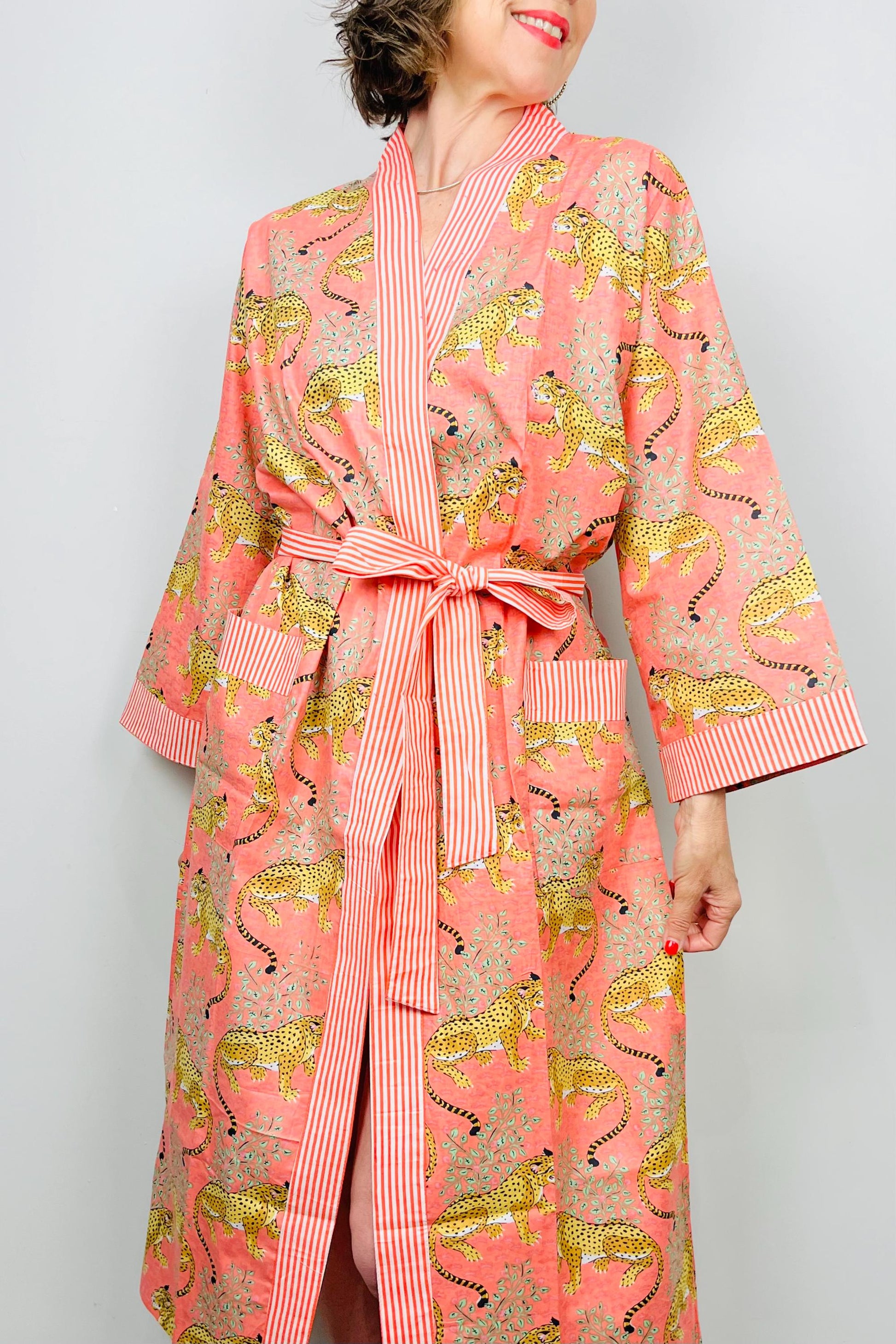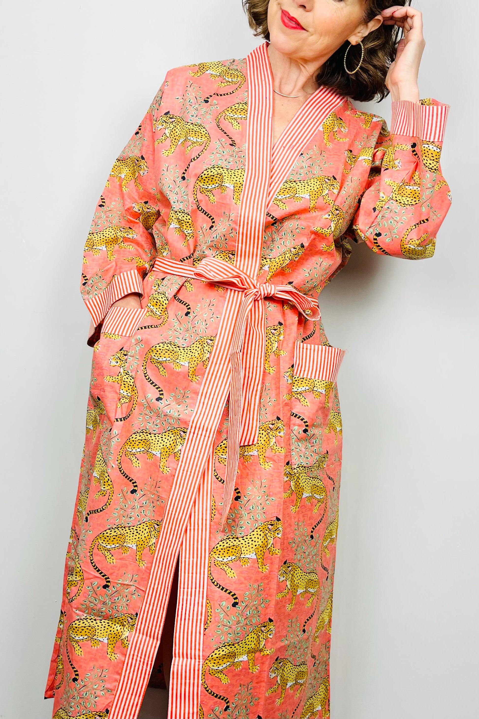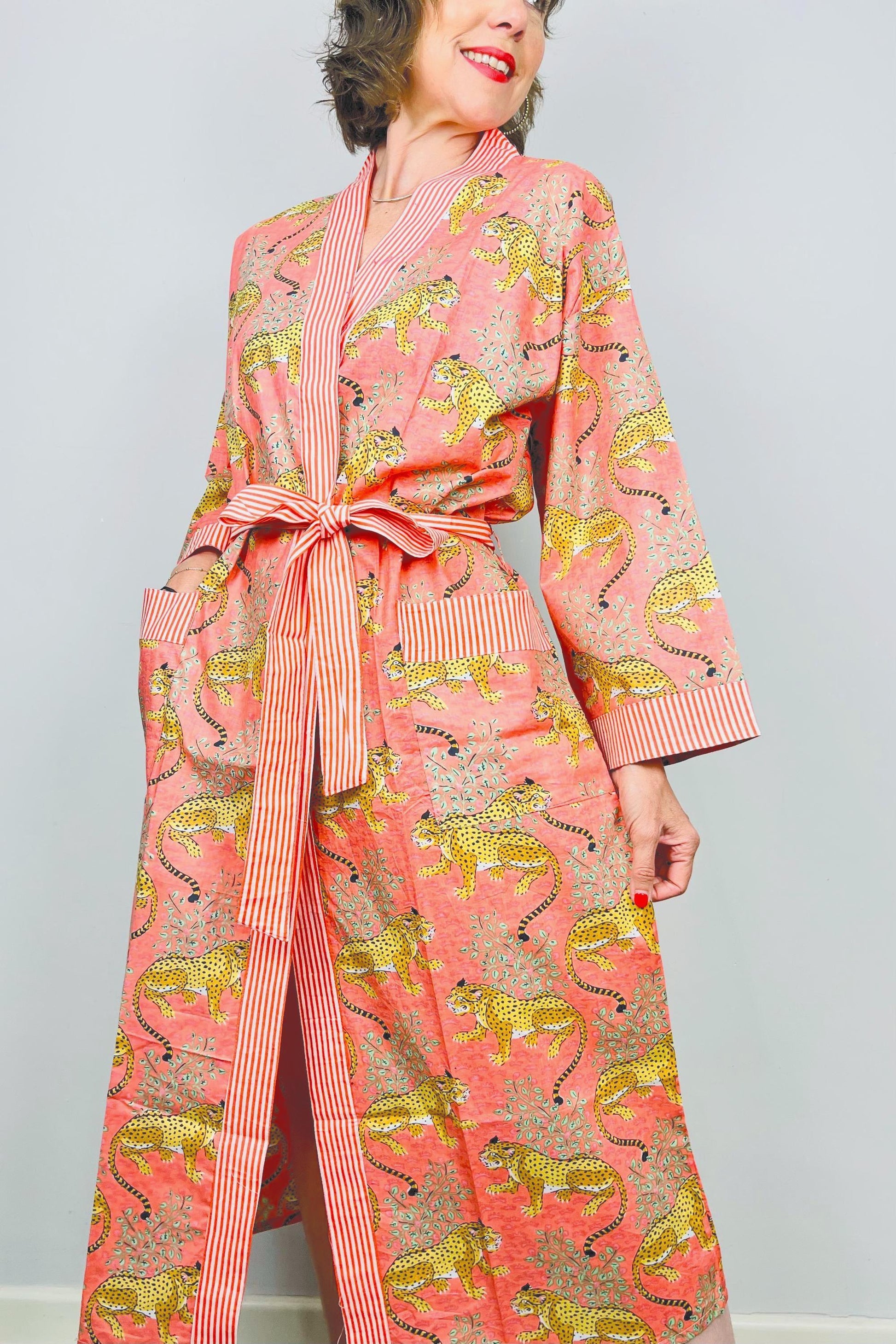 🌸 Beautiful handmade 100% sustainable cotton Kimono, hand block printed, with long sleeves and tie belt, and pockets, Soft cotton and roomy to wear.