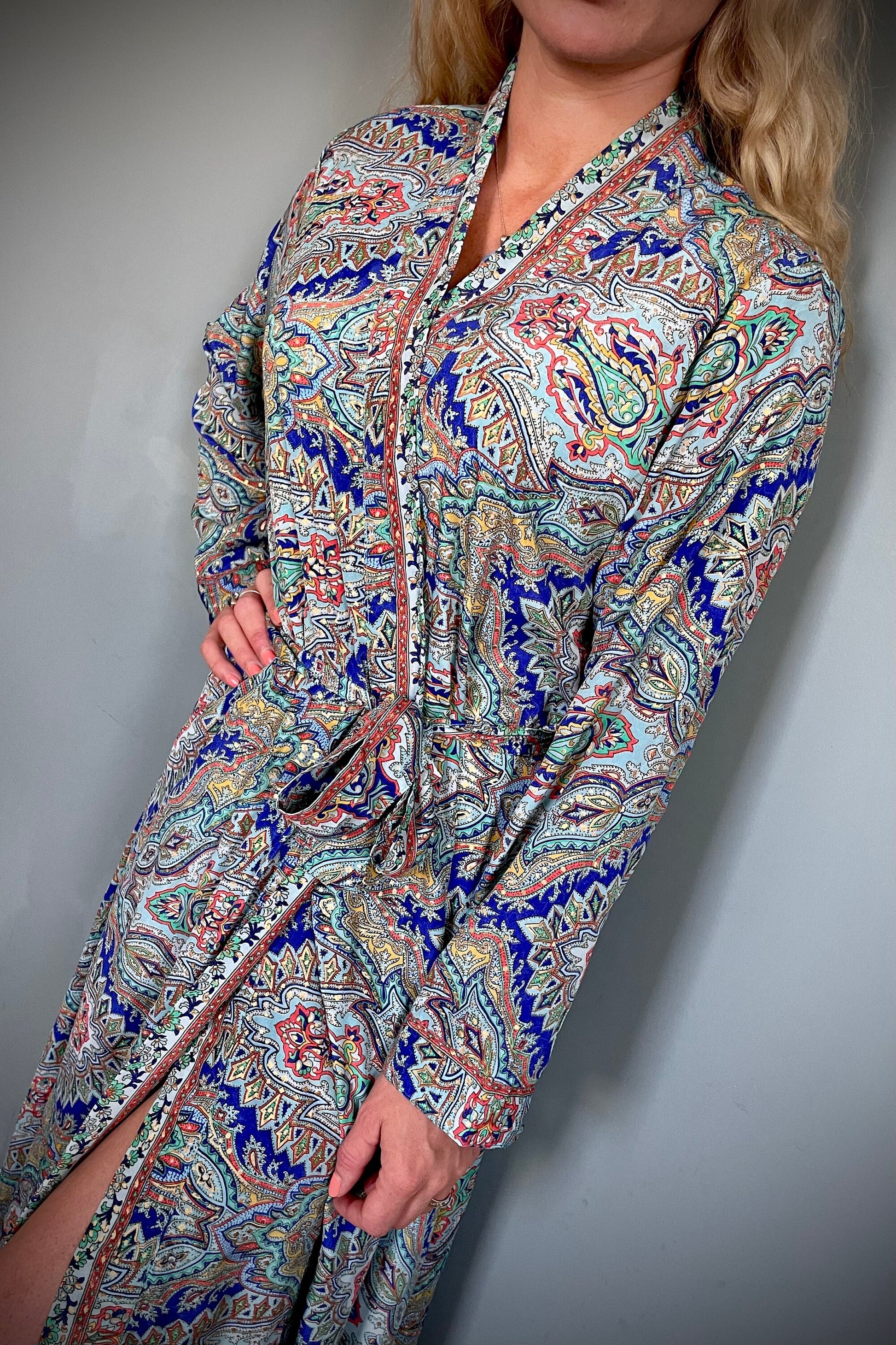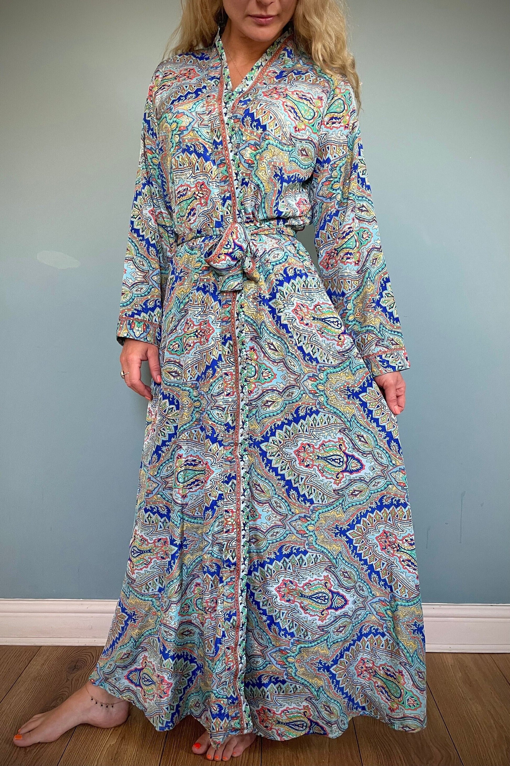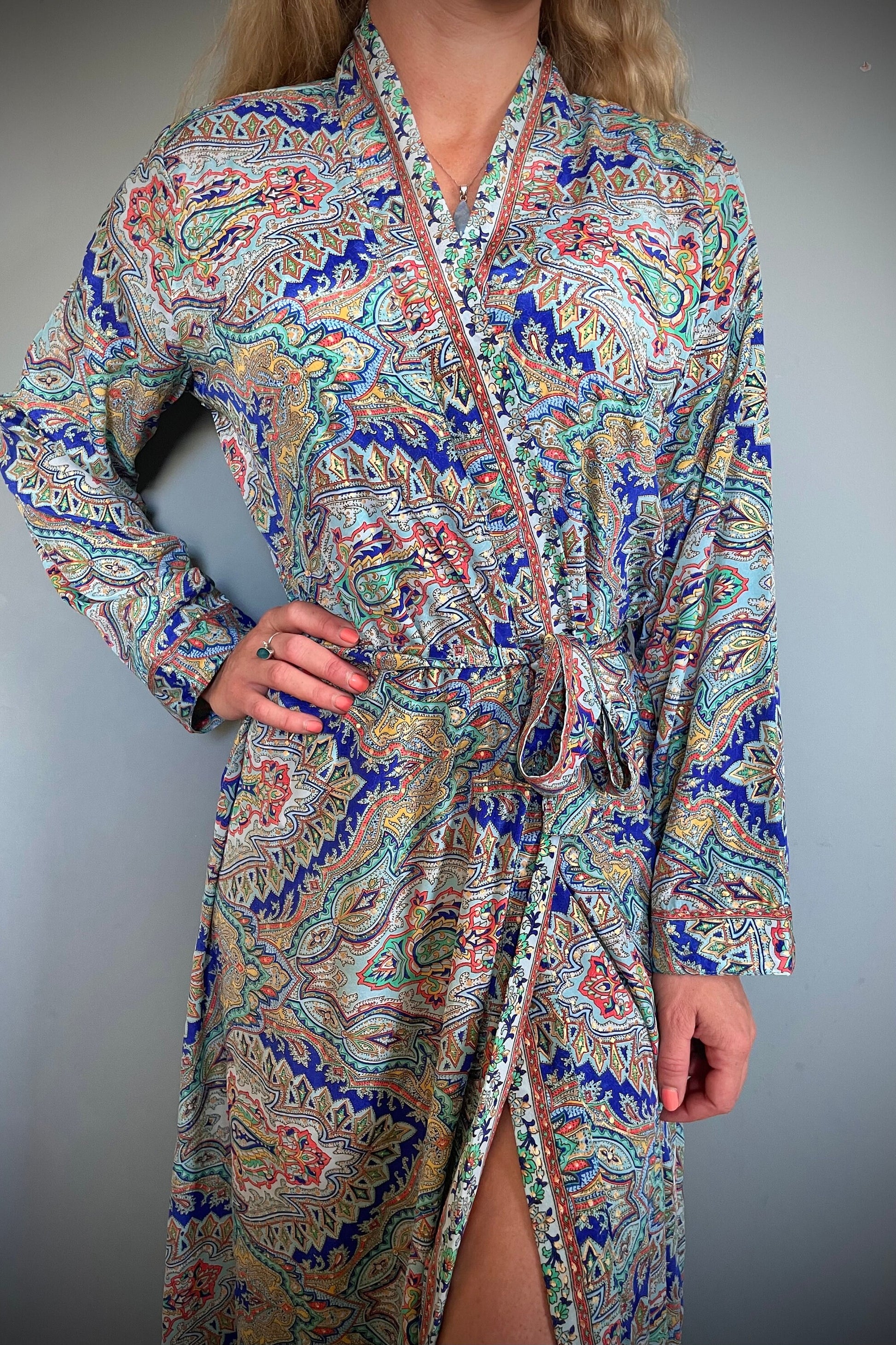 Beautiful handmade vintage / boho-style Kimono, Indian Silk with bright colourful print. These gowns have a beautiful gold effect running through the print, quite subtle, but adds a shimmer to the fabric when it catches in the light, They are very feminine.